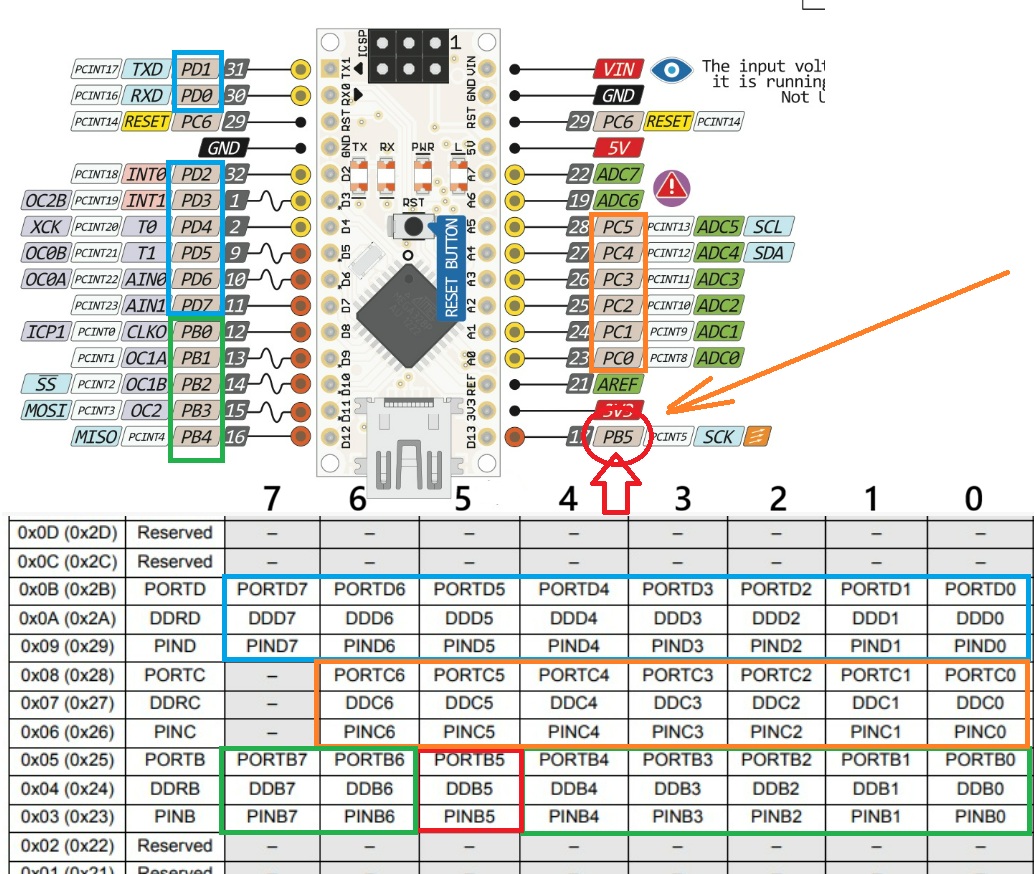Ad esempio, invece di usare i numeri dei pin e dei registri, si usano nomi come 12, PB0 o D8. Questi nomi astratti aiutano nei programmi generici, ma qui è più semplice usare i numeri veri dei registri.